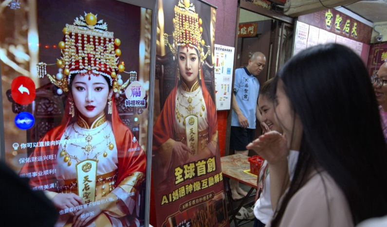 柔州天后宫全球首创AI妈祖可互动解签 信徒与人工智能妈祖互动。